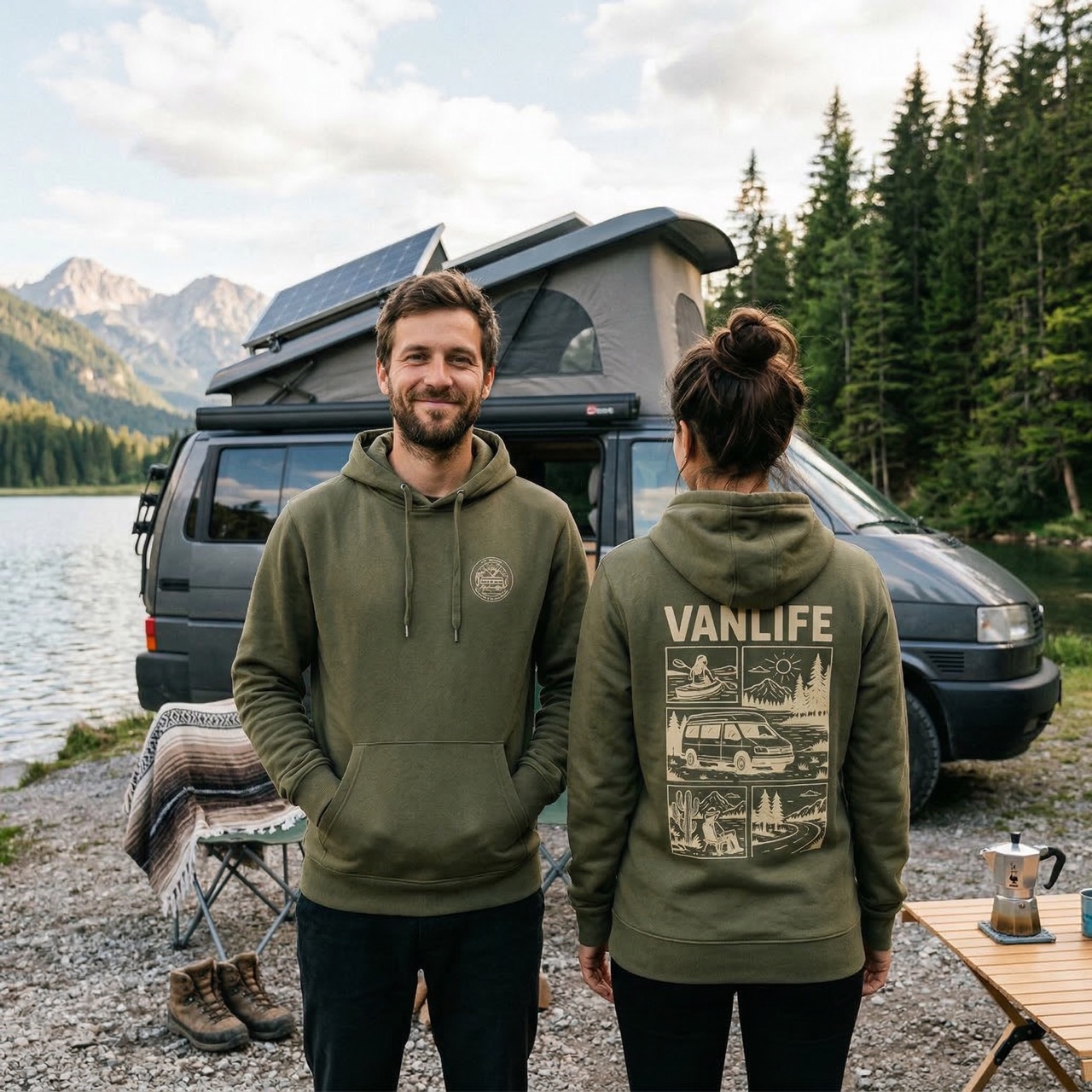 Bluza z kapturem Vanlife Forest to niezastąpiony towarzysz każdej wyprawy — od górskich serpentyn po poranki przy jeziorze.